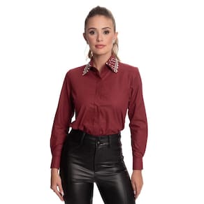 Camisa Social Feminina Gola Bordada Brilho Moderna Teodoro - Vinho - P