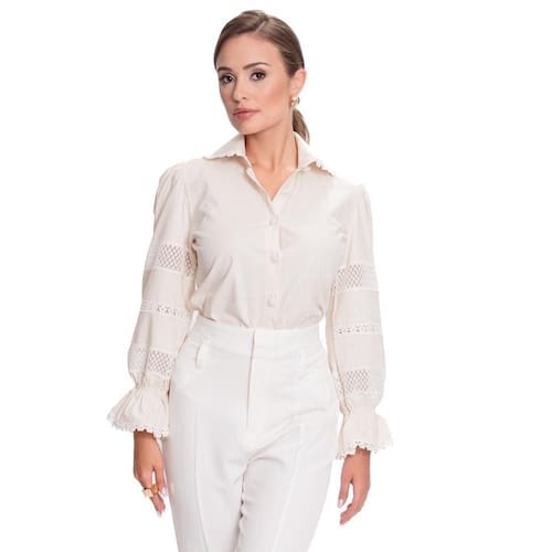 A nossa querida Camisaria Teodoro apresenta sua nova e luxuosa linha de camisas femininas. Conheçam este lindo lançamento "Teresa Teodoro" e se apaixonem! Camisa feminina manga longa em linho e algodão de alta qualidade com modelagem acinturada. Manga longa bem bufante com composição de rendas largas e estreitas da cor da peça em toda a sua extensão. Colarinho tipo italiano com a gola bem exuberante, contornada também por renda. Fechamento com botões encapados no mesmo tecido da peça. Veste bem com calça para looks mais formais e acompanha também saia para um look mais romântico. Peça icônica, chique e clássica, é desejo no guarda roupa de toda mulher.