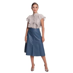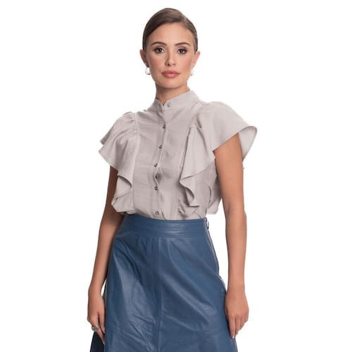 A nossa querida Camisaria Teodoro apresenta sua nova e luxuosa linha de camisas femininas. Conheçam este lindo lançamento "Teresa Teodoro" e se apaixonem! Esse modelo é confeccionado em linho, com a trama lisa, possui modelagem acinturada e gola alta estilo padre. As mangas são curtas formadas por babados volumosos na frente e costas. Possui fechamento frontal com botões metalizados. O tecido é naturalmente mais pesado e não marca muito, com lindocaimento, típico de tecidos naturais como o da peça. Tecido com alta durabilidade. Veste bem com calça para looks mais formais e acompanha também saia oushort para dias mais quentes. Peça muito versátil e confortável, seguindo tendências de moda.