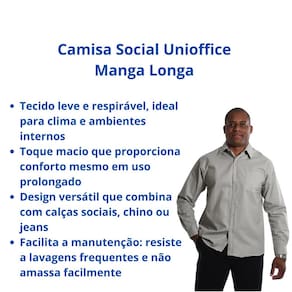 Camisa Social Unioffice Manga Longa Elegância e Conforto para o Trabalho A Camisa Social Unioffice Manga longa é a escolha perfeita para quem busca um visual alinhado e funcional em dias mais quentes. Com modelagem clássica e acabamento de qualidade, garante caimento impecável e liberdade de movimento ao longo do expediente.