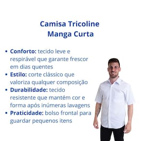 Camisa Tricoline Manga Curta Conforto e Elegância em Todas as Ocasiões A camisa tricoline manga curta é confeccionada em tecido 100% algodão de alta qualidade, com colarinho rígido e botões frontais, oferecendo caimento perfeito e toque suave. Seu bolso frontal único adiciona praticidade sem comprometer o visual clean.