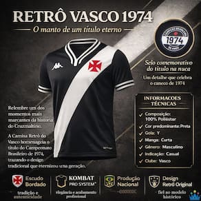 Relembre um dos momentos mais marcantes da história do Vasco da Gama com a Camisa Kombat Home Vasco 74, um manto que homenageia a conquista do Campeonato Brasileiro de 1974. Inspirada no uniforme que marcou esse título histórico, a camisa apresenta design clássico e elegante, trazendo o escudo do Gigante da Colina bordado no peito, reforçando a identidade cruzmaltina. Na parte traseira, o selo comemorativo aplicado na nuca celebra o caneco de 1974, eternizando esse momento inesquecível para o torcedor. Além do visual tradicional, o modelo alia conforto e tecnologia. Confeccionada em tecido de alta performance com tecnologia Quick Dry, a camisa auxilia no afastamento do calor da pele, garantindo secagem rápida e mantendo o corpo fresco e seco durante o uso — ideal para o dia a dia, lazer ou momentos casuais.