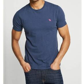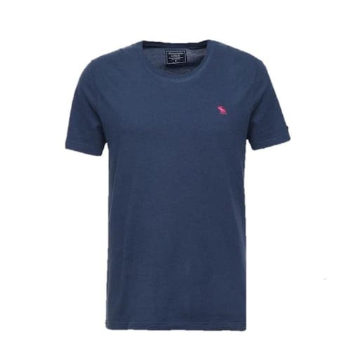 Camiseta clássica masculina azul, confortável de manga curta, com detalhe de ícone bordado na cor vermelho no lado esquerdo do peito e decote redondo.