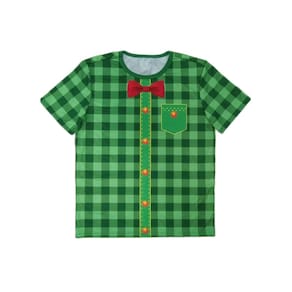 A camiseta é toda estampada, inclusive a gravata borboleta.