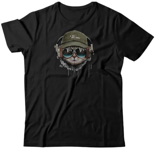 ***Para estampas em camiseta escura, o processo de produção exige um tratamento no tecido com um composto chamado primer. Esse composto pode eventualmente deixar uma leve marca no entorno da estampa que desaparece num curto espaço de tempo ou na primeira lavagem. ***