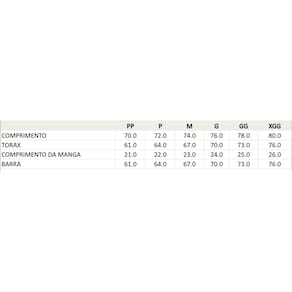 Tamanho PP Tórax: 61 cm Comprimento: 70 cm Mangas: 21 cm Barra: 61 cm