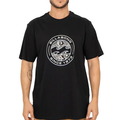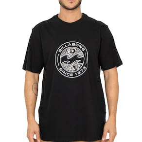 Camiseta Billabong feita em modelagem Corefit, meia malha, estampa aplicada na frente e etiqueta da marca aplicada na lateral do lado esquerdo de que veste.