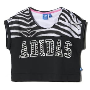 Camiseta cropped Adidas Originals com logo frontal grande e estampa zebra é perfeita para as fãs da marca e que gostam de peças diferentes com estampas de motivos animais. Ideal para uso cotidiano, pós treino, shows e eventos.