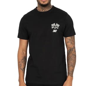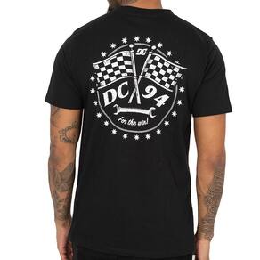 Camiseta Dc Shoes feita em modelagem regular, meia malha 30.1, estampa frente e costas e etiquetas personalizadas.