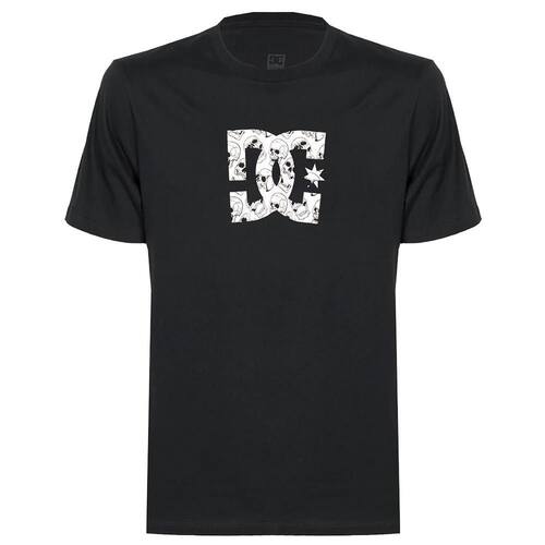 Camiseta Dc Shoes feita em modelagem regular, meia malha 30.1, estampa frontal e etiquetas personalizadas.