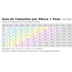 Sugestão de tamanho (grade asiática com equivalência BR):