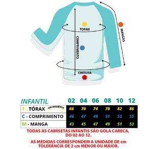 Camisa com proteção Solar Infantil, Tamanhos 04 ao 16 \nProtege a Pele dos Efeitos nocivos do Sol \nUv protection e o fio inteligente que protege sua pele da ação dos raios UV-A e UV-B com fator de proteção solar de 30+ a 50+. \nPara os mais exigentes, as camisas da King Brasil com proteção UV protegem a pele durante a exposição ao sol com maior conforto e funcionalidade. \nDevido a modificações no DNA do fio, essa funcionalidade tem ação prolongada durante toda vida útil do produto. \nE a alta tecnologia e segurança que você sente na pele. \n- 100% poliéster\n- Proteção Solar UV\n- Impressão é feita em papel Epson de alta qualidade durável toda vida útil do produto.\n- Gola padre\n- Corte raglã\n- Tecido Tecno Dry Fit \n- Tecnologia de alta Absorção\n- Tecido leve\n- Conforto Térmico