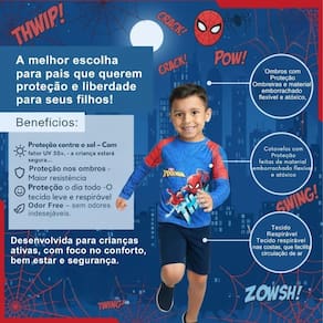 - Marca: Nathor - Modelo: Camiseta de Proteção - Estampa:Spidey - Cor: Azul / Vermelho - Material da Proteção: Emborrachado, Flexível e Atóxico - Composição do Tecido: Poliéster, Elástano e Poliamida - Peso: 115g