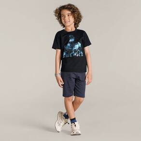 Camiseta infantil menino confeccionada malha, peça conta com mangas curtas, estampa localizada de super heróis e gola redonda. Combine com as bermudas da coleção e tenha looks que eles amam. Aposte!