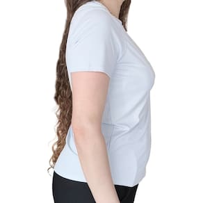 Modelagem regular alongada com manga curta e gola careca, estilo confortável e adequado para treino ou uso casual.