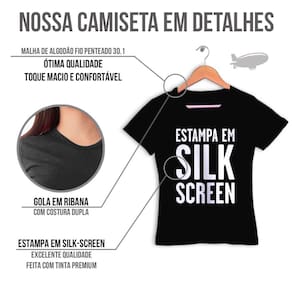 Nossas camisetas contam com modelagem exclusiva, moderna e ajustada, tanto feminina quanto masculina, com malha penteada de excelente qualidade, 100% algodão*, fio 30.1, com costura reforçada. A estampa é em silk-screen com ótimo acabamento.