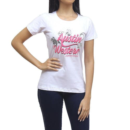 Camiseta Feminina na qualidade Austin Western, fabricada em tecido 100% Algodão na cor Branco, possui mangas curtas, gola tradicional, estampa com pedrinhas strass na parte frontal. Sendo um peça perfeita para seu dia a dia, podendo ser usada em diversas situações!