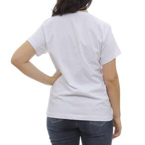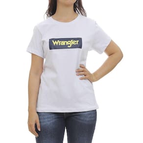 Camiseta feminina Wrangler fabricada em tecido 100% Algodão na cor Branca, possui mangas curtas, gola tradicional e estampa na parte frontal.