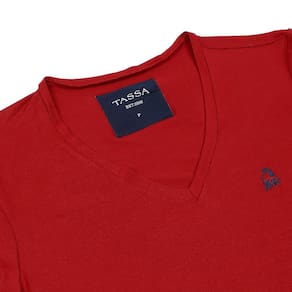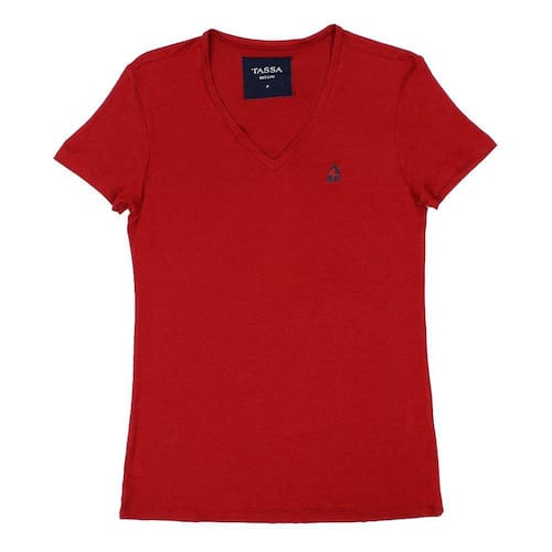 Camiseta feminina Tassa fabricada em tecido 94% Viscose e 6% Elastano na cor Vermelha, possui mangas curas, gola modelo V e bordado no peito.
