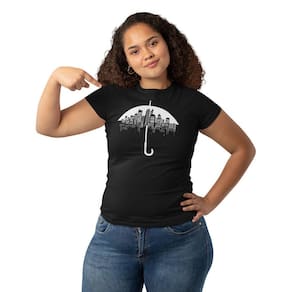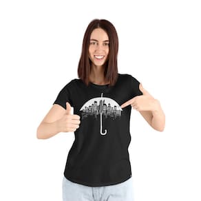 Estampa de um guarda-chuva em forma de prédios adornam o design. Camiseta com um toque urbano e cheio de estilo. Vista-se e mantenha-se preparado para enfrentar qualquer clima com elegância.