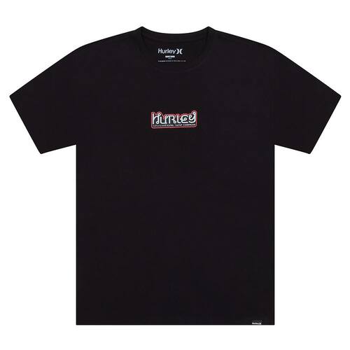 Camiseta Hurley feita em meia malha 30.1, gola rebatida, estampa localizada base d'agua e etiqueta clips ONE&ONLY na barra.