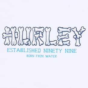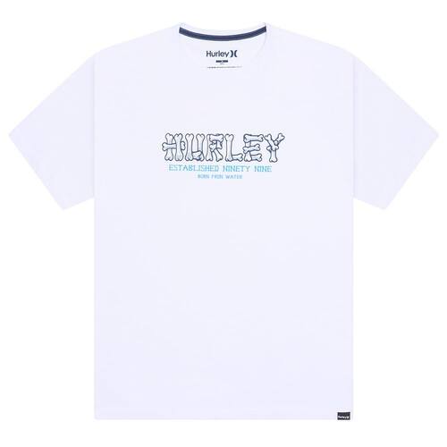 Camiseta Hurley feita em meia malha 30.1, gola rebatida, estampa localizada base d'agua e etiqueta clips ONE&ONLY na barra.