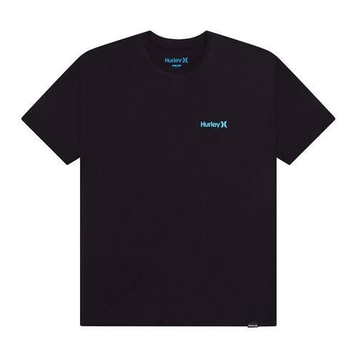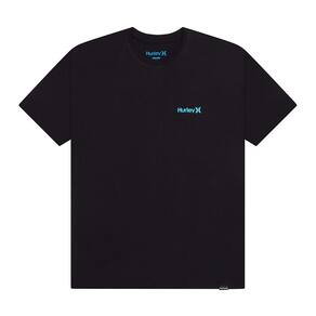 Camiseta Hurley feita em meia malha 30.1, gola rebatida, estampa localizada base d'agua e etiqueta clips ONE&ONLY na barra.