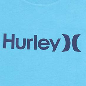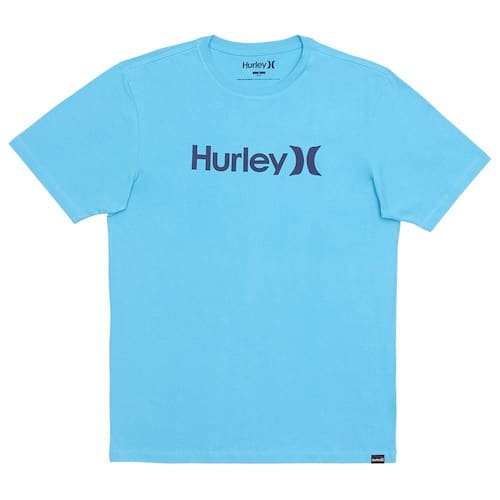 Camiseta Hurley feita em meia malha 30.1, gola rebatida, estampa localizada base d'agua e etiqueta clips ONE&ONLY na barra.