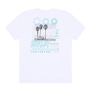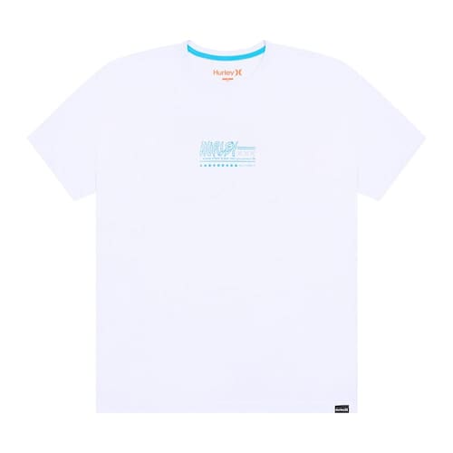 Camiseta Hurley feita em meia malha 30.1, gola rebatida, estampa localizada base d'agua e etiqueta clips ONE&ONLY na barra.