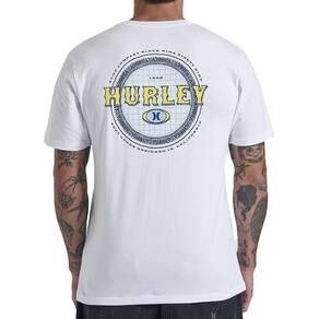 Camiseta Hurley feita em meia malha 30.1, gola rebatida, estampa localizada base d'agua e etiqueta clips ONE&ONLY na barra.