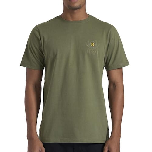 Camiseta Hurley feita em meia malha 30.1, gola rebatida, estampa localizada base d'agua e etiqueta clips ONE&ONLY na barra.