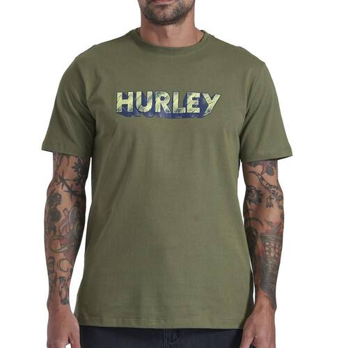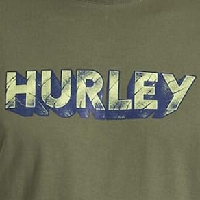 Camiseta Hurley feita em meia malha 30.1, gola rebatida, estampa localizada base d'agua e etiqueta clips ONE&ONLY na barra.