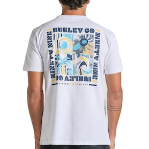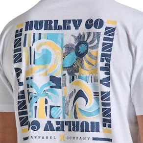 Camiseta Hurley feita em meia malha 30.1, gola rebatida, estampa localizada base d'agua e etiqueta clips ONE&ONLY na barra.