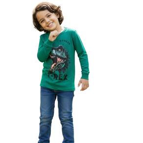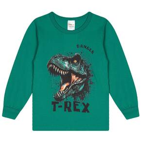 Camiseta infantil confeccionada em tecido macio e confortável, ideal para o dia a dia. Possui mangas longas, gola redonda e estampa divertida de dinossauro T-Rex, perfeita para os pequenos que adoram aventura. A modelagem garante liberdade de movimentos, sendo ideal para escola, passeios e momentos de lazer.