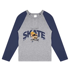 Camiseta infantil manga longa com estampa frontal temática skate. Modelo confortável, ideal para o dia a dia, escola e passeios. Possui gola redonda e mangas em cor contrastante, trazendo um visual moderno e estiloso.