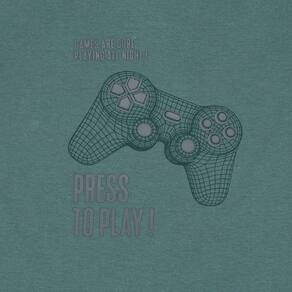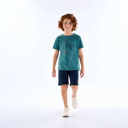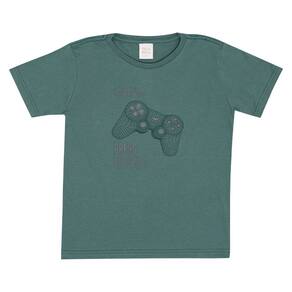 Mantenha seu menino confortável e estilo durante os dias quentes! Camiseta meia malha na cor floresta com estampa com controle de video game e escrita em gel relevo, gola redonda com reforço e mangas curta. Tradução: jogos são demais, jogar a noite toda! Aperte para jogar