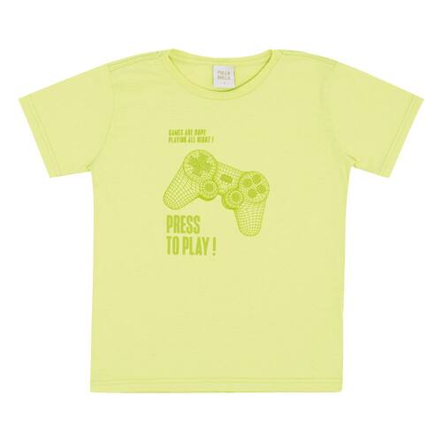 Mantenha seu menino confortável e estilo durante os dias quentes! Camiseta meia malha na cor lima com estampa com controle de video game e escrita em gel relevo, gola redonda com reforço e mangas curta. Tradução: jogos são demais, jogar a noite toda! Aperte para jogar