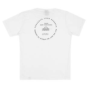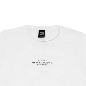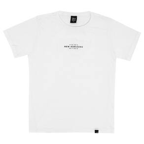 Camiseta juvenil confeccionada em meia malha na cor branca, possuí gola reforçada, mangas longas e estampa frontal e nas costas com escritas "novos horizontes. Preserve sua essência, mas não tenha medo de mudar. Tenha novos horizontes." ideal para usar no dia a dia para passeios radicais.