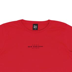 Camiseta juvenil confeccionada em meia malha na cor vermelha, possuí gola reforçada, mangas longas e estampa frontal e nas costas com escritas "novos horizontes. Preserve sua essência, mas não tenha medo de mudar. Tenha novos horizontes." ideal para usar no dia a dia para passeios radicais.