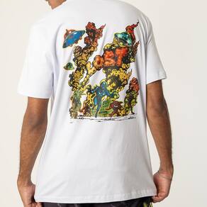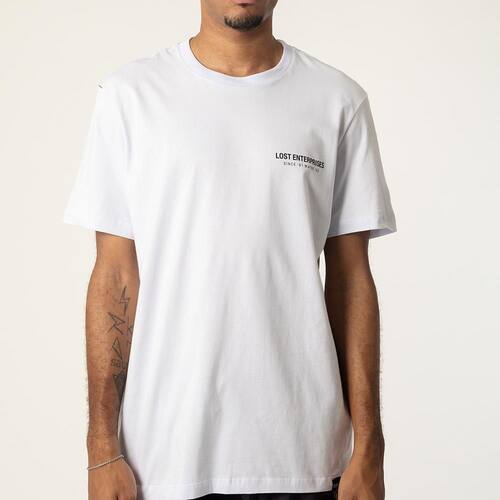 Camiseta Lost feita em meia malha 30.1, estampa no peito e costas e etiquetas personalizadas.