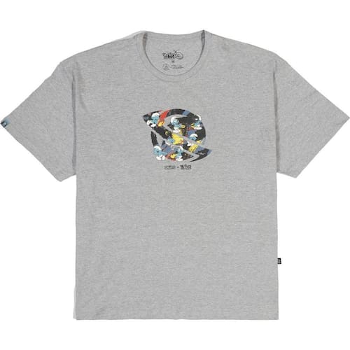 Camiseta Lost em collab com Os Smurfs, que conta com meia malha penteada 30/1, estampa frontal dos Smurfs, modelagem oversized e etiquetas personalizadas da collab.