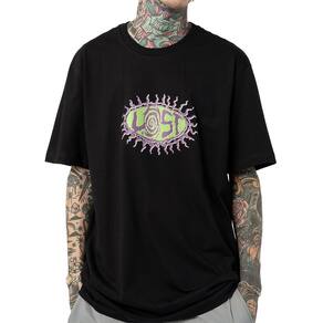 Camiseta Lost meia malha penteada 30.1, com estampa na parte frontal e etiquetas personalizadas.