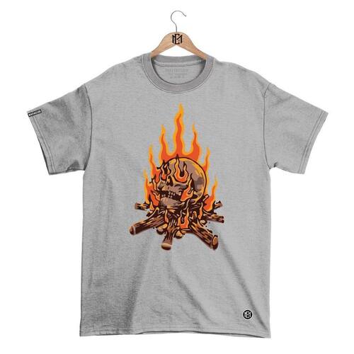 Camiseta Mafiaclub Gola Redonda Estampa CAVEIRA FOGO Streetwear fio 30.1 Penteado - Cinza - G