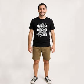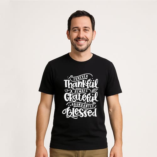 Vista sua fé, sua gratidão e sua energia positiva com estilo. Nossa camiseta preta com a frase "Agradecido, Grato e Abençoado, Blessed" é mais do que uma peça de roupa — é uma declaração de espírito.