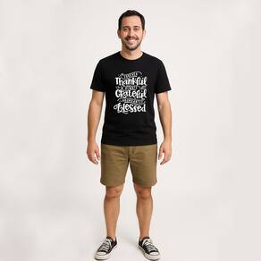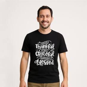 Vista sua fé, sua gratidão e sua energia positiva com estilo. Nossa camiseta preta com a frase "Agradecido, Grato e Abençoado, Blessed" é mais do que uma peça de roupa — é uma declaração de espírito.