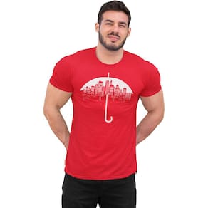 Estampa de um guarda-chuva em forma de prédios adornam o design. Camiseta com um toque urbano e cheio de estilo. Vista-se e mantenha-se preparado para enfrentar qualquer clima com elegância.