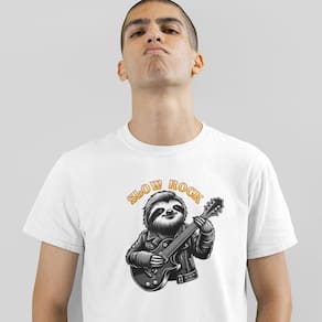 Esta camiseta é uma celebração do ritmo relaxado da preguiça combinado com o poder do rock! Com um bicho-preguiça tocando um 'rock lento', você adiciona um toque de humor e irreverência ao seu estilo. Vista esta camiseta e entre no groove tranquilo. O ritmo pode ser lento, mas o slow rock dos anos 70,80 e 90 prevalecem até hoje!