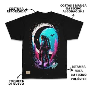 Camiseta Masculino Astronauta Desbravador Moon apresenta um desenho de um Astronauta na Lua desbravando Lugares desconhecidos, com estilo artístico e moderno, que cobre grande parte da camiseta. A peça é feita com a estampa em poliéster e costas e manga em algodão, o que proporciona um tecido macio, confortável e resistente. A camiseta tem mangas curtas e gola redonda, sendo uma opção versátil para diversas ocasiões e estilos.