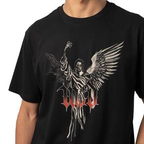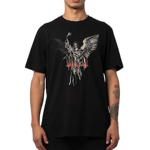 Camiseta MCD feita em malha penteada 30.1, estampa frontal e etiquetas personalizadas.