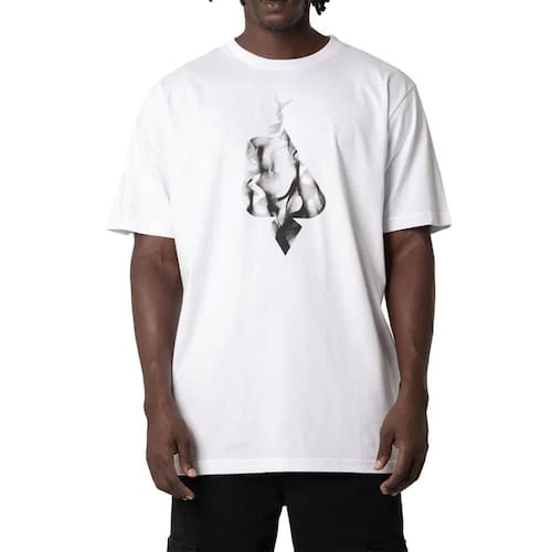 Camiseta MCD feita em meia malha penteada 30.1, estampa frontal e etiquetas personalizadas.